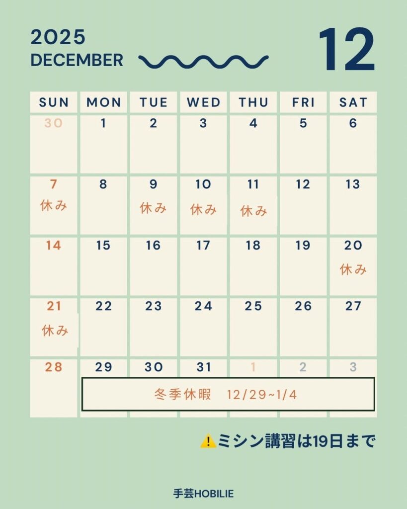 ただいま、ミシンスペースのご利用日は、できるだけお客様のご都合の良い日に合わせるように調整しています。ご希望の方は、店舗までお問い合わせ下さい。